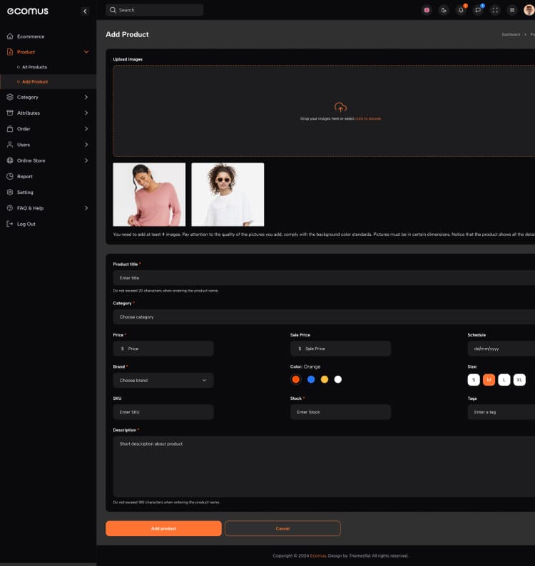 Inserção de produtos com descrições otimizadas para buscas, imagens de qualidade e variações.